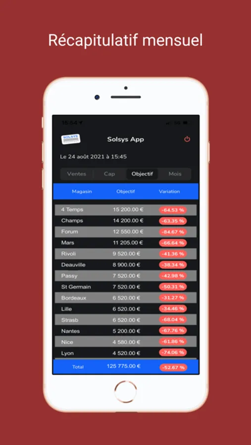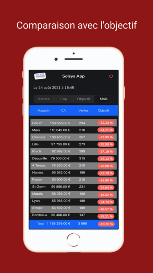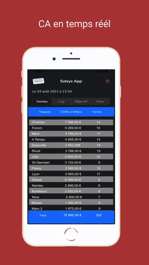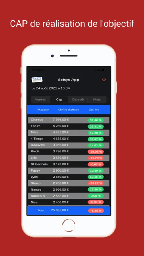 Solsys CA est une appli, qui couplée aux logiciels Solsys points de vente, vous permet d'obtenir, sur votre iPhone, vos chiffres d'affaire en temps réel de vos boutiques. Egalement, elle vous indiquera si vous atteindrez vos objectifs journaliers et affichera une récapitulatif du CA mensuel en cours