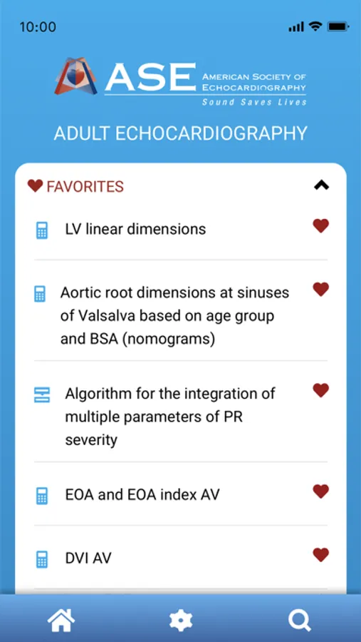 ASE’s EchoGuide provides access to over 50 calculators, algorithms, and charts. EchoGuide was developed based on key ASE guidelines for use by healthcare professionals providing cardiac care. One special feature in the app is that users have the ability to select their favorite interactive tools for easy access.