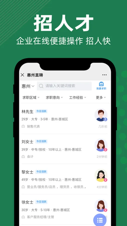 在惠州,找工作/招人才,就上惠州直聘!惠州直聘是西子湖畔旗下的人才招聘平台,致力于为求职者提供惠州本地优质招聘信息、为企业提供招聘渠道,帮助每一个求职者在惠州直聘找到合适的工作!真实招聘,为人才选好企业,为企业招人才