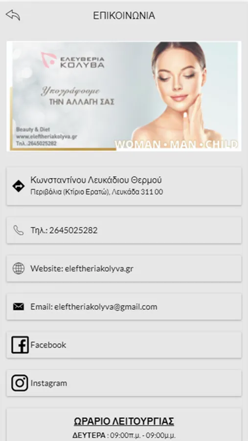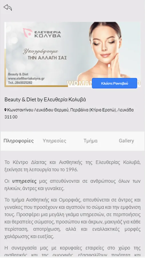 Το Κέντρο Δίαιτας και Αισθητικής της Ελευθερίας Κολυβά, ξεκίνησε τη λειτουργία του το 1996, στη Λευκάδα, προσφέροντας αρχικά τις υπηρεσίες του στον τομέα Δίαιτας και Διατροφής.