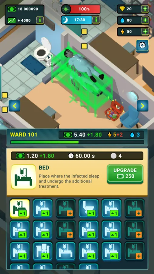 Monitor zombies' condition to prevent bursts of aggression. Upgrade the laboratory where medicines are created. Keep your clinic’s buildings clean, install quality showers to improve hygiene. The virus impacted the psychology of Infected badly and they need entertainment to be cured. Place new TVs to the wards, benches to the yard, and even buy guitars to play music around the firepit. This will help your patients to defeat the inner beast.