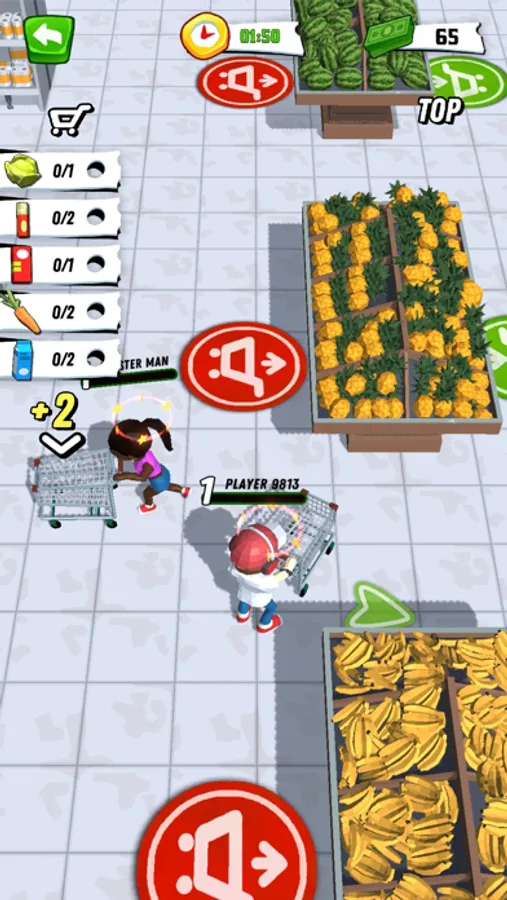 While moving, you may bump into a competitor. As you do so, the products will fall, but you can pick them up. After all the goods from the list are collected, run to the cash desk to check your score.
