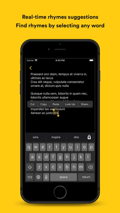 Just select some text and you'll see rhymes suggestions. Search rhymes based on what you've already written!