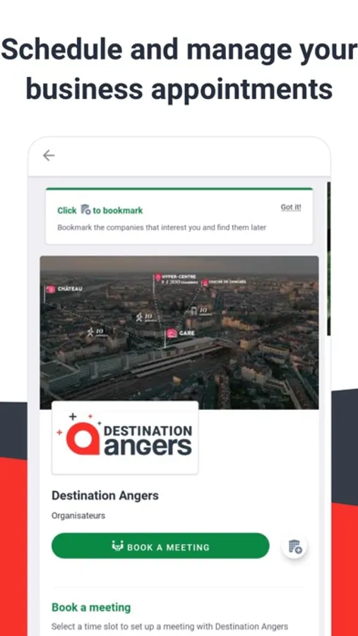 Sign up to the Destination Angers Events platform and access a wealth of useful, interesting content before, during and after any event you've signed up for! On the agenda: contact, appointments, live streaming, replay, exhibitor catalogue, personal visit itinerary, and many more online services which will allow you to optimise your experiences at the conferences, fairs and events organised and hosted by the Destination Angers teams: Exhibition Centre, Conference Centre and Angers Tourism Office.