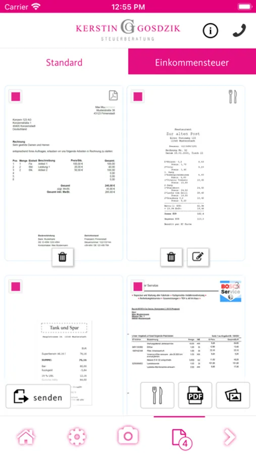 Fotografieren Sie einfach Ihre Belege und senden diese mit einem Klick direkt aus der App an die Kanzlei.