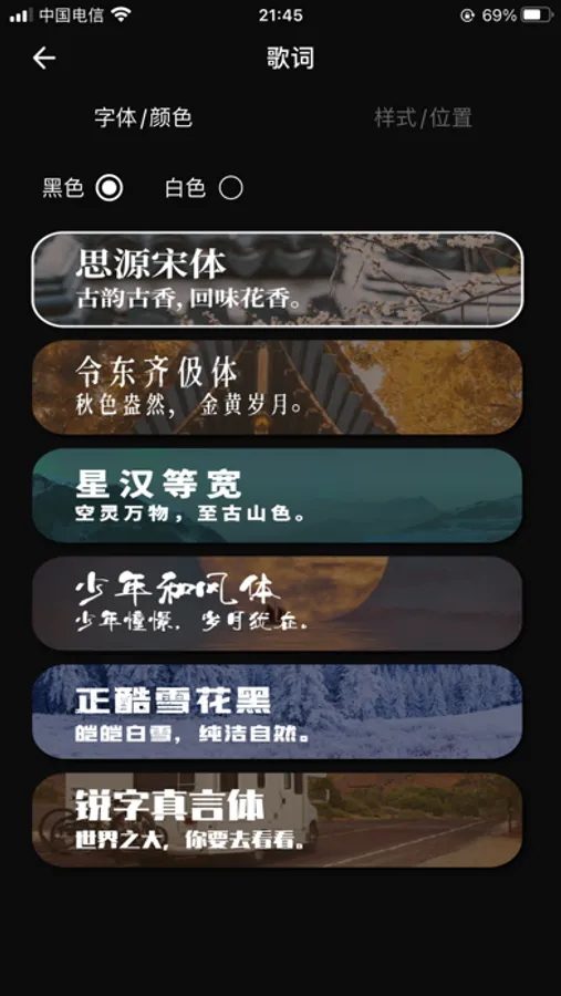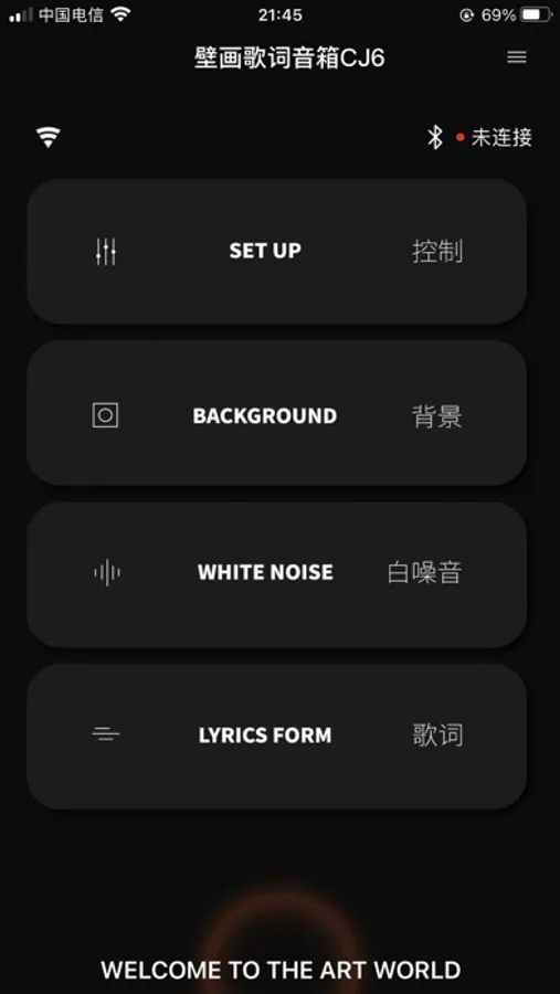 一款通过蓝牙/WiFi实现手机与音箱设备连接的APP。连接后,通过手机APP一方面可以控制音箱设备切换歌曲、调节音量大小、调节显示屏亮度和切换不同音效,同时可以通过手机APP来切换静态和动态显示背景,也可以设置自定义的静态背景,也可以通过手机APP来设置选择音箱播放的白噪音,有助于用户休息使用,另还可以通过手机APP来设置所显示歌词的字体、颜色、呈现方式等。