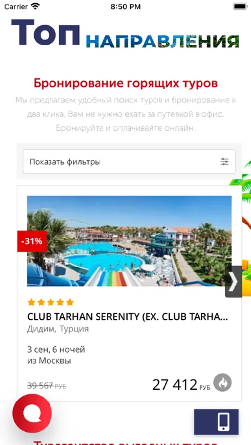 В нашем приложении вы получите доступ к Поиску горящих туров, бронированию и покупке.