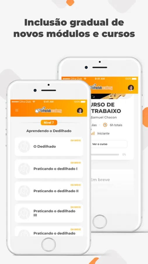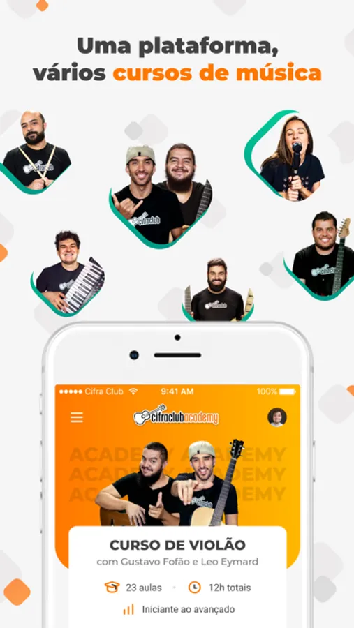 Uma assinatura, vários cursos de música! Você estuda pelo app do Cifra Club Academy a partir de uma assinatura que te dá direito a acessar todos os cursos e módulos disponíveis, além de todas as atualizações. São vários planos disponíveis que você escolhe de acordo com o seu tempo e o seu bolso!