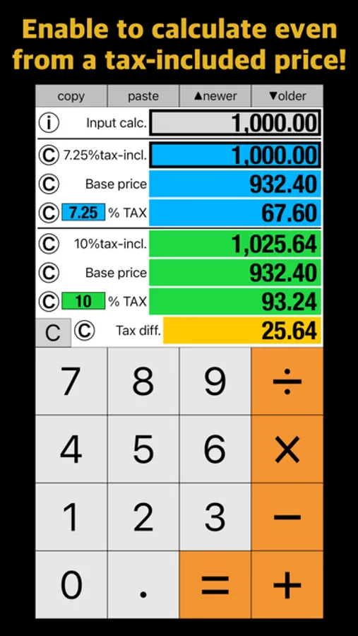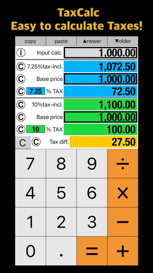 "Tax Calculator - iTaxCalc” is a calculator that calculates Tax amount. It calculates Tax amount and others by using a calculated input price as a tax-included price or a Base price.