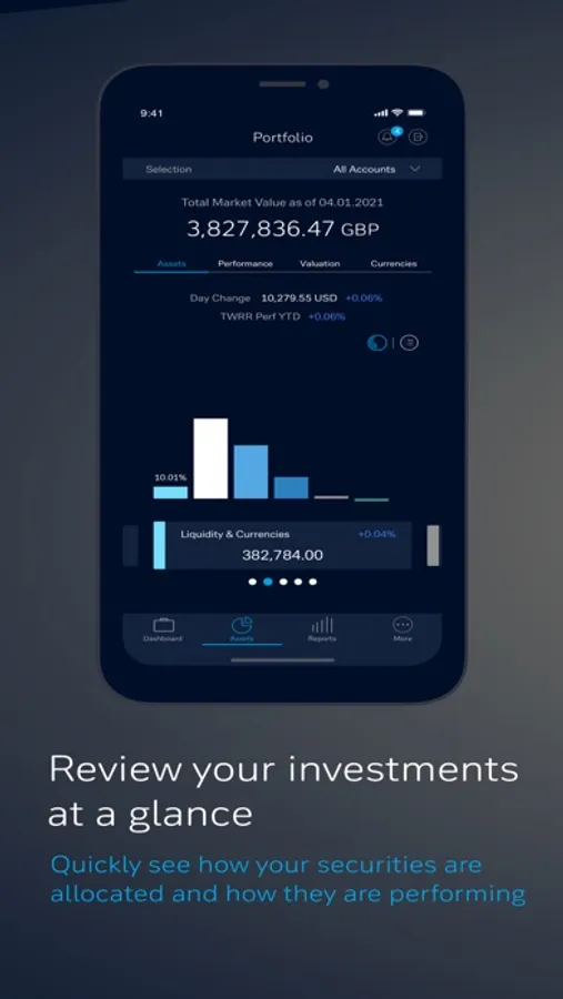 • Portfolio and dashboard overview: Get a detailed overview of your portfolios which includes asset class allocation, currency holdings, valuation and performance along with additional details on holdings, maturities and transactions