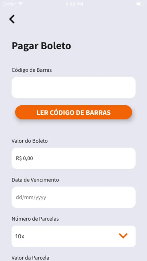 Clique em Pagar Boleto para abrir o leitor de código de barras, escolha a quantidade de parcelas e em seguida finalize com os seus dados.