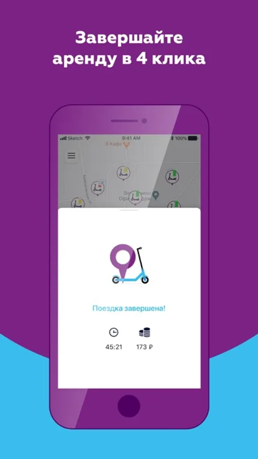 Мы даём Вам самокат, чтобы передвигаться быстро, без пробок, с комфортом и ветерком! Всё управление происходит через бесплатное приложение. Вам нужно только крепко держаться за руль, смотреть по сторонам, быть внимательным.