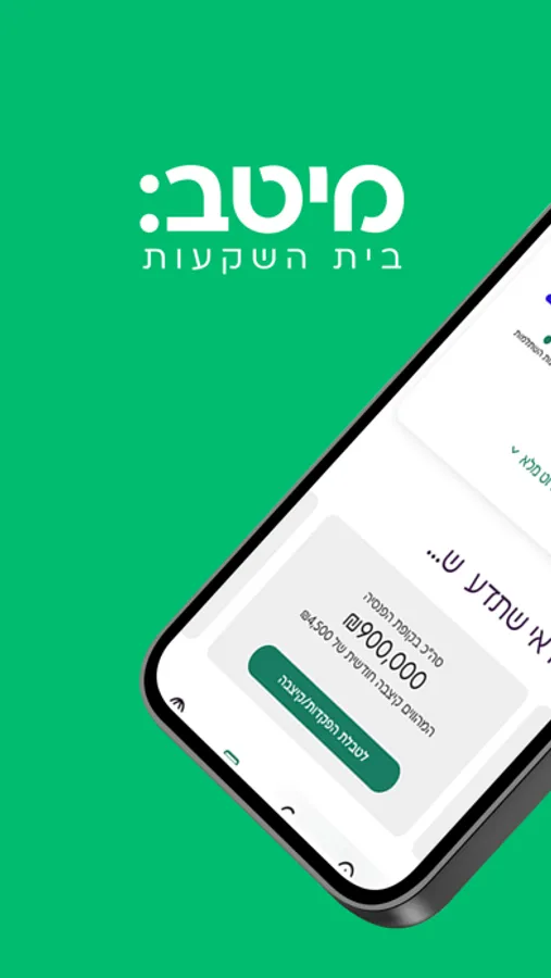 כבר יותר מ-30 שנים שאנו משרתים למעלה ממיליון לקוחות, תוך שמירה על מקצועיות ברמה הגבוהה ביותר, הנובעת מניסיון עשיר, והכרה עמוקה של שוק ההון. כאחד מבתי ההשקעות הגדולים והמובילים בישראל, שמנו לעצמנו את דגל החדשנות, במטרה לפרוץ דרך ולתת את פתרונות השירות הטובים והנוחים ביותר למגוון לקוחותינו וצרכיהם. זה גם העיקרון שעמד לנגד עינינו בפיתוח אפליקציית מיטב: כלי דיגיטלי, פשוט וידידותי שמעניק לך שליטה מלאה בניהול החסכונות שלך.