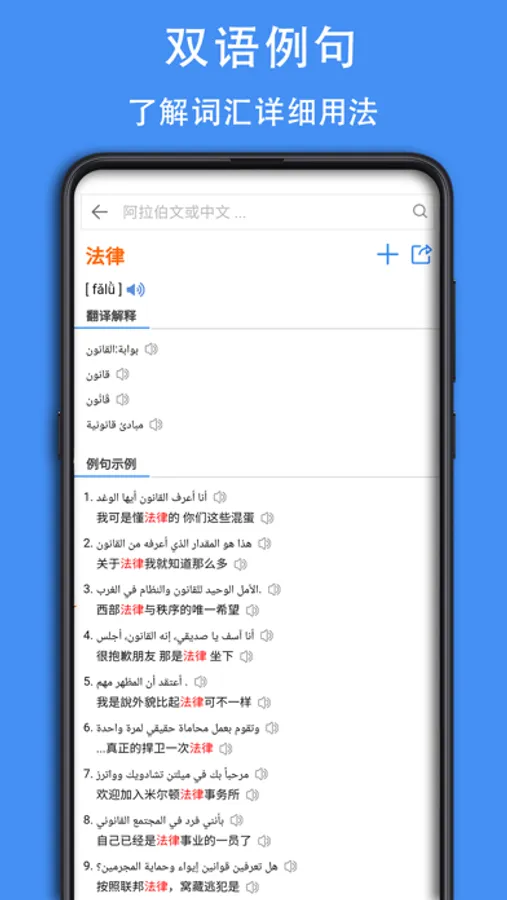 2. 詳盡的解釋。包含阿拉伯文中文雙語例句發音等,讓您全面了解詞彙用法