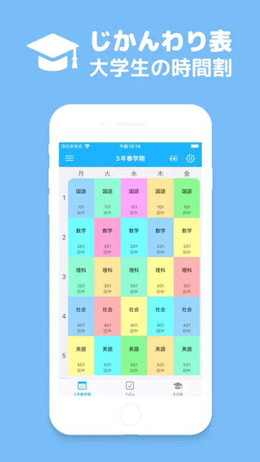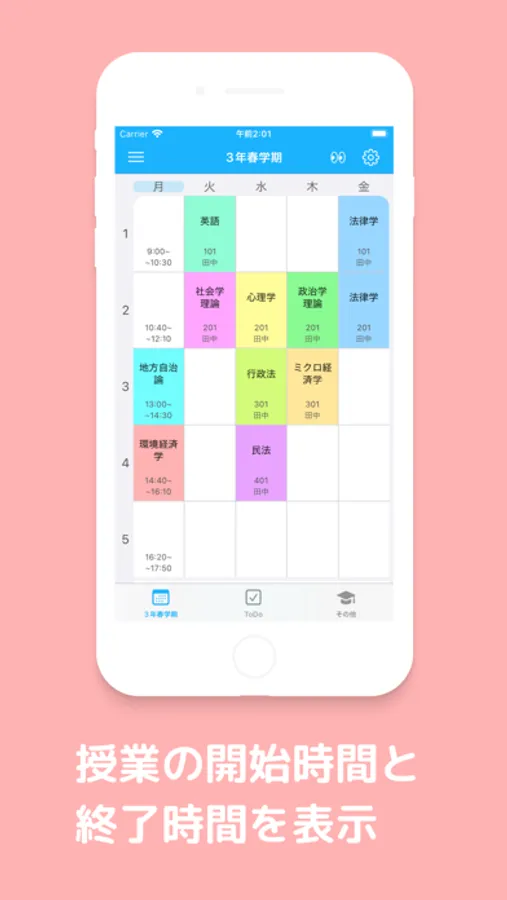 右上の「目のアイコン」を押している間、授業の「開始時間」と「終了時間」を表示できるようにしました。右上の「歯車アイコン」から時間を設定できます。