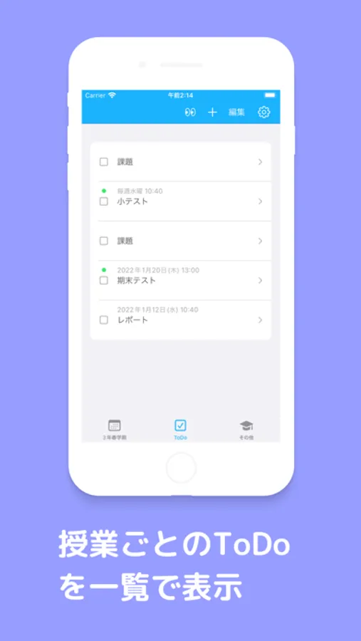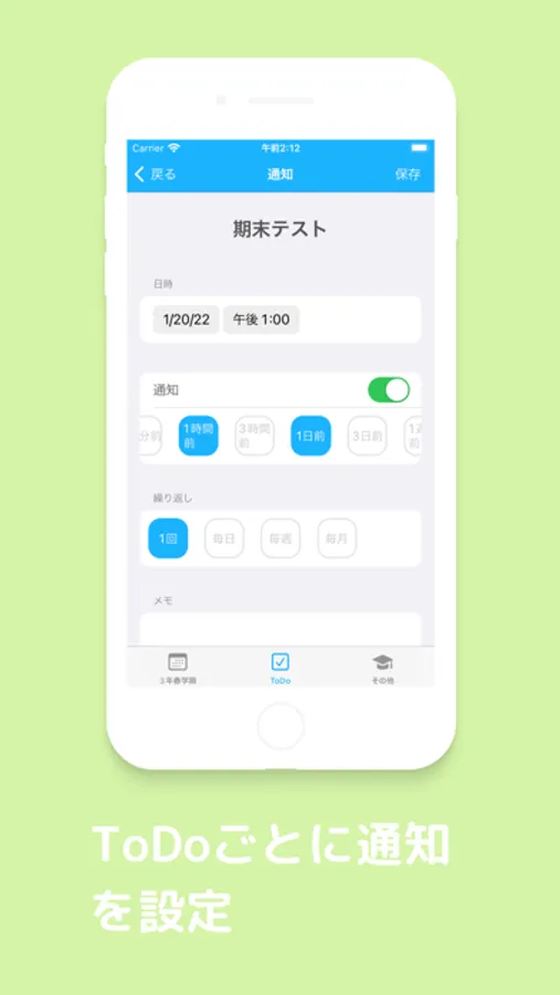 ToDoの表示画面右上の「目のアイコン」を押している間、通知の日時とオン/オフを確認することができます(通知を設定していない場合は表示されません)。
