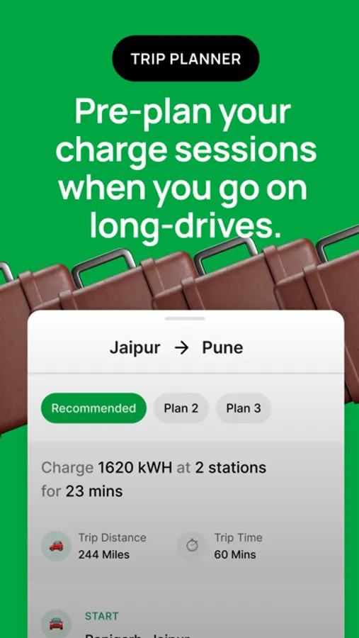 - Confidently go on long drives to anywhere across India with built-for-you Trip Planner. Input only your starting point, destination, and battery level, and our algorithm will do the rest to provide an ideal set of charging stops on your trip.