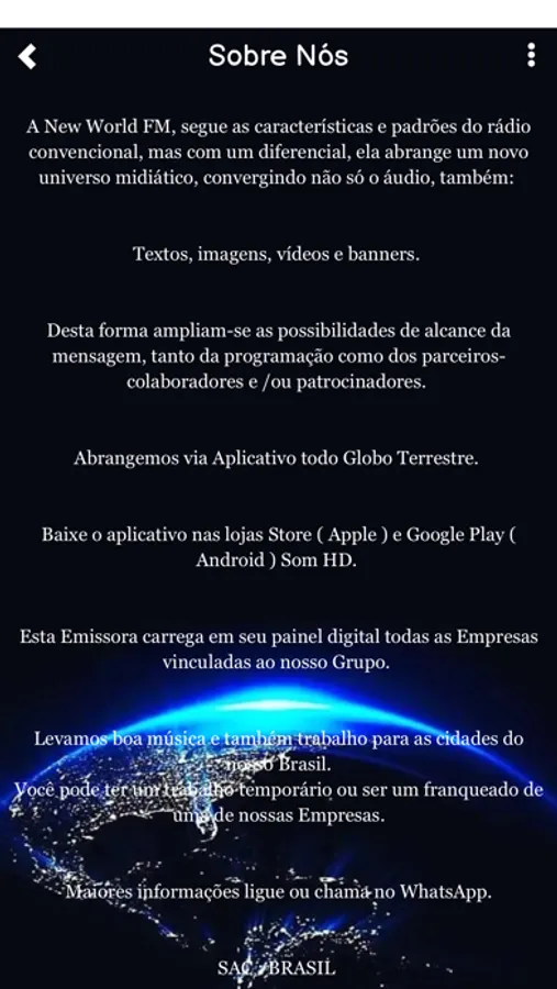 A New World FM, segue as características e padrões do rádio convencional, mas com um diferencial, ela abrange um novo universo midiático, convergindo não só o áudio, também: