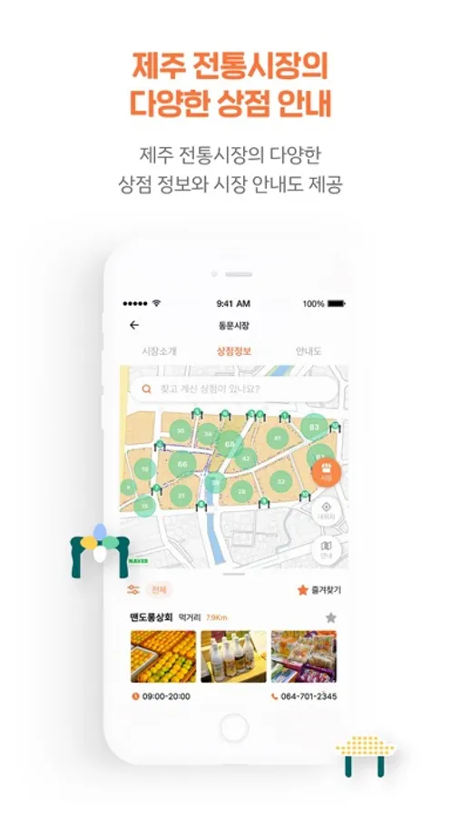 - 제주 지역 특색이 담긴 동문시장과 올레 시장 투어를 위해 다양한 상점정보 그리고 시장지도를 제공합니다.