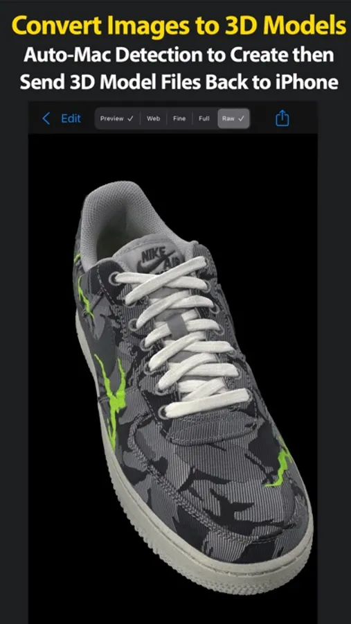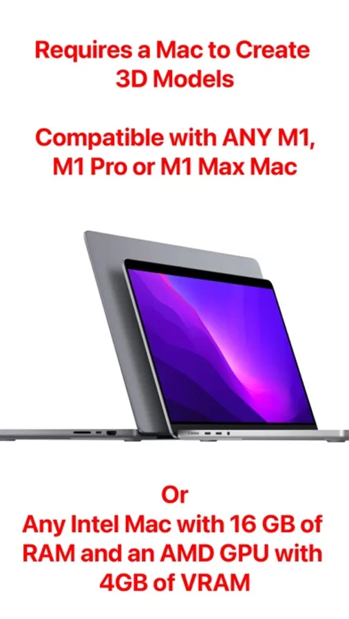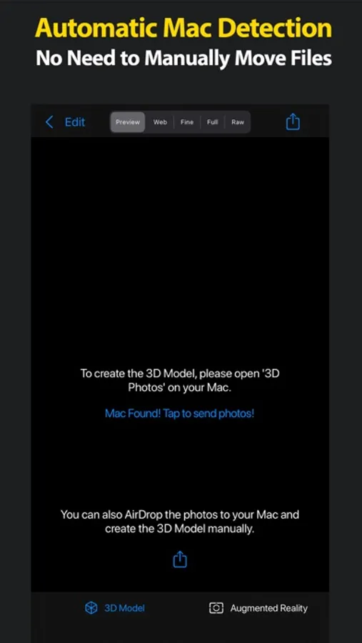Introducing 3D Photos! Magically create stunning 3D Models from your photos taken either on your iPhone/iPad or any other camera. A Mac is required to perform the 3D models. Use your iPhone/iPad with AR Dome to take photos of your object from every angle, including underneath. Then open 3D Photos on your Mac, your iPhone/iPad will auto-detect it's open and with one tap, the conversion from images to a 3D model will begin. When your Mac is finished creating the 3D files, it will automatically transfer the files back to your iPhone/iPad. All you do is take the photos and press a button!