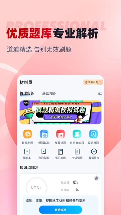 材料员题库内含考点练习,全国通用卷以及地区卷模拟练习,以及按照固定考试比重的随机式的抽题的真题考场,成绩单实时记录考试数据,一点一滴的反馈考生近期学习状态以及自我正确率的提升,大大的给予考生通过考试的信心。