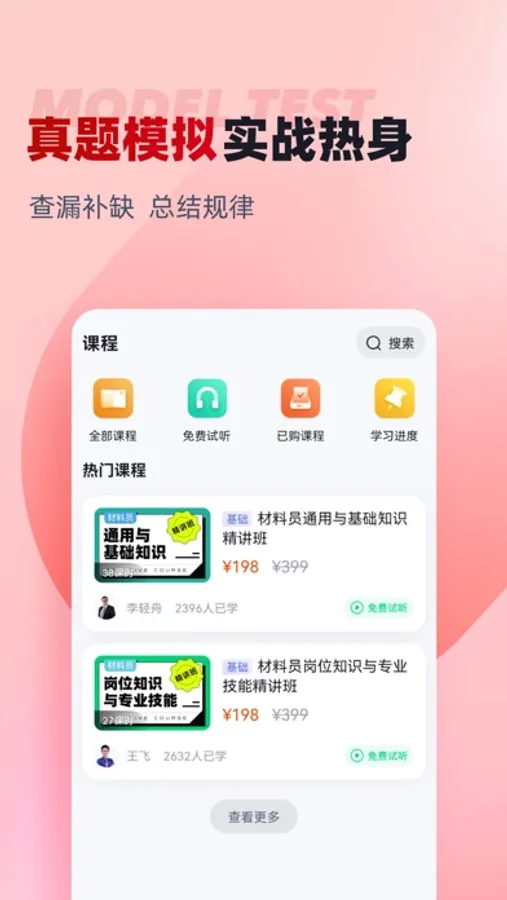 材料员题库新增搜题功能,材料员考试中的疑问一搜便知,更支持语音和拍照搜题。