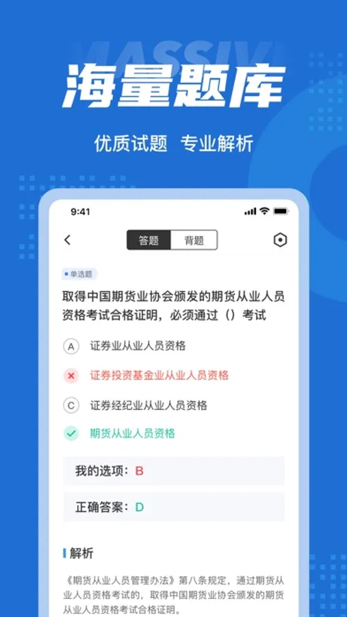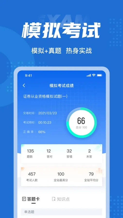 证券从业资格题库内含考点练习,全国通用卷以及地区卷模拟练习,以及按照固定考试比重的随机式的抽题的真题考场,成绩单实时记录考试数据,一点一滴的反馈考生近期学习状态以及自我正确率的提升,大大的给予考生通过考试的信心。