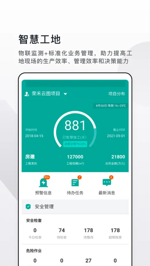 SmartPM-智慧工地平台包含施工安全、质量、机械、劳务、进度等项目管理及物联监测应用,适用于房建、路桥、隧道等项目,可帮助企业和项目实现作业标准化、管理数字化、决策智慧化。