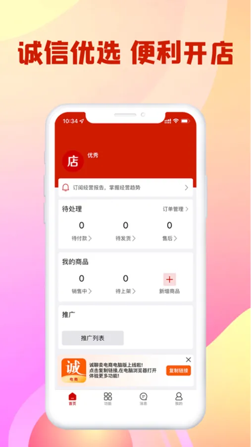 诚聊卖电商为商家提供免费的手机开店平台,方便快捷管理订单、分析店铺数据、平台日常动态。