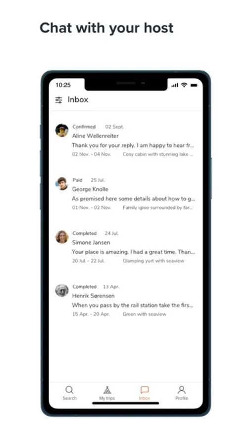 Easily manage your bookings through the app, including cancellations, payments, and getting arrival instructions. For questions, comments, or thank-you notes, get in touch with hosts directly via in-app chat.