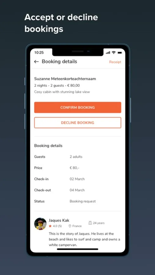 Easily manage bookings via the app. Hosts can pause and publish their listings, block or unblock their availability calendar, accept or decline booking requests, and see both overviews and details for all bookings and requests. Hosts can also edit their profiles and chat with their guests.