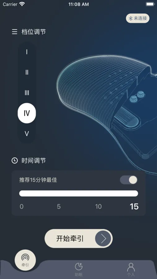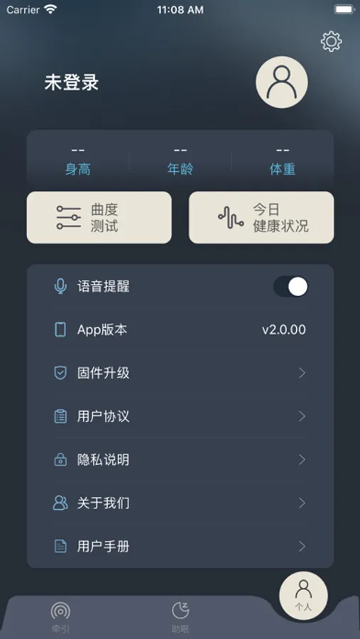 本APP为寝放松系列产品智能调节枕控制端,用于控制智能调节枕的工作模式,令智能调节枕处于牵引模式或者助眠模式。APP不仅能根据用户要求调整牵引高度和助眠频率,满足对枕头的任何睡眠高度设置,引导用户在无感状态下进入睡眠状态,还能记录并展示用户颈曲度变化。