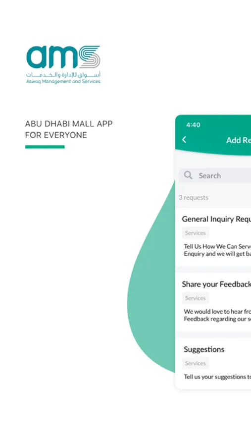 AMS App is a central place for both mall customers and employees to be informed about management latest announcements, apply for available services and monitor the status of their requests.