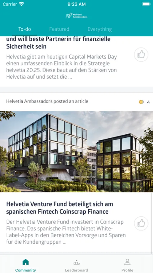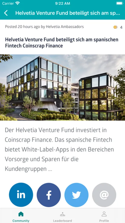 Helvetia Ambassadors enables Helvetia employees to share selected articles by and about Helvetia Insurance on their own social media profiles. The content includes contributions such as stories, expert hints and reports on relevant topics and events.
