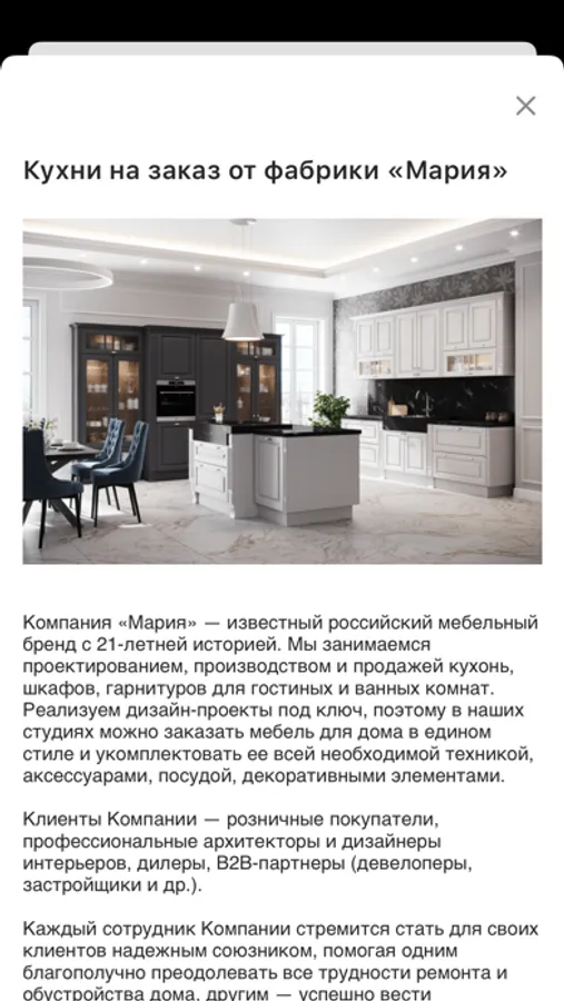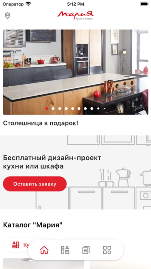 Воспользуйтесь всеми преимуществами мобильного приложения Мария, чтобы совместно с дизайнером разработать индивидуальный дизайн-проект и получить мебель, отражающую образ жизни, вкусы и пожелания каждого конкретного заказчика. Мы предоставляем безграничные возможности для дизайна и предлагаем продукт, соответствующий трендам в мировой интерьерной моде. Более 25 моделей в классическом, неоклассическом и современном стилях. Более 200 цветов фасадов, 175 вариантов оформления столешниц, широкий ассортимент фурнитуры и аксессуаров делают каждую кухню неповторимой.