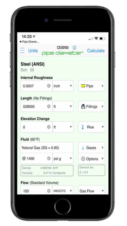 The Gas Pipe Diameter App has an intuitive user interface that allows for easy entry of the input data, including changes in elevation, and selection of valves & fittings.