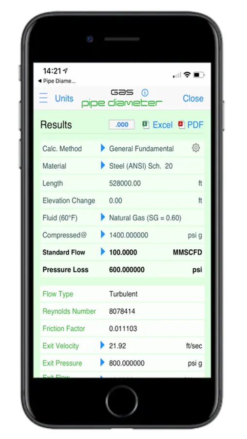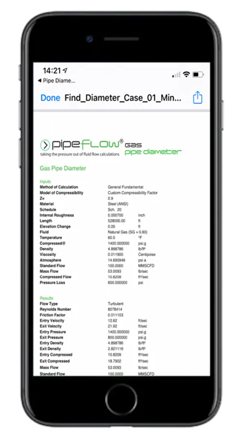Pipe Flow Gas Pipe Diameter calculation results have been verified against multiple cases of published data from well known sources. The results of these calculations are included in the Compressible Results Verification PDF document which can be accessed from within the App.