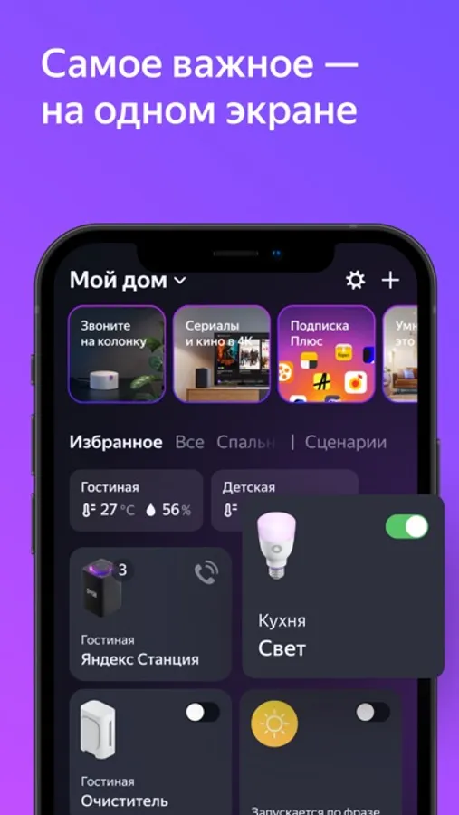 Дом с Алисой — приложение, в котором удобно настраивать умный дом и управлять им даже в дороге. Подключайте лампочки, пылесосы, датчики и тысячи других устройств — и контролируйте их здесь или через колонку.