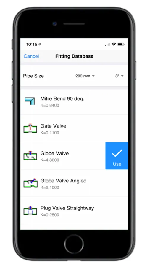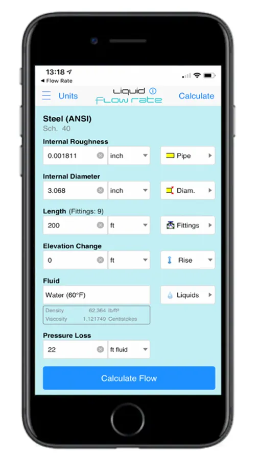 The Liquid Flow Rate App has an intuitive user interface that allows for easy entry of input data, including changes in elevation, and selection of valves & fittings.
