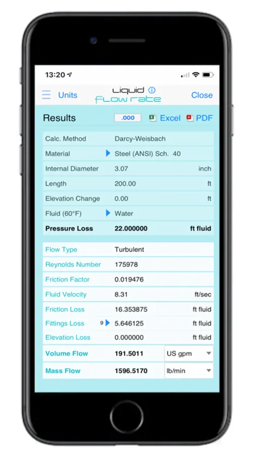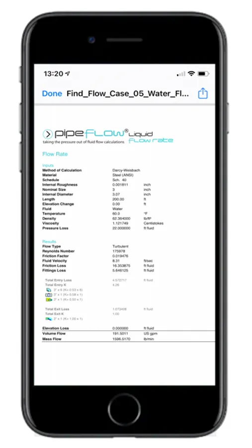 Engineers can easily perform their flow rate calculations in the office or on site. Professional Excel and PDF reports can easily be shared with others. Results can also be saved to the library within the App.