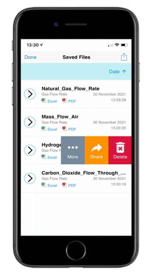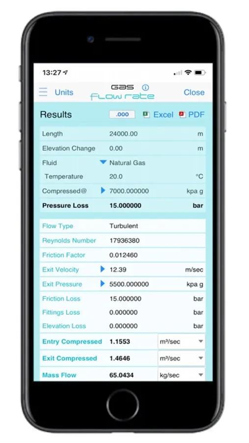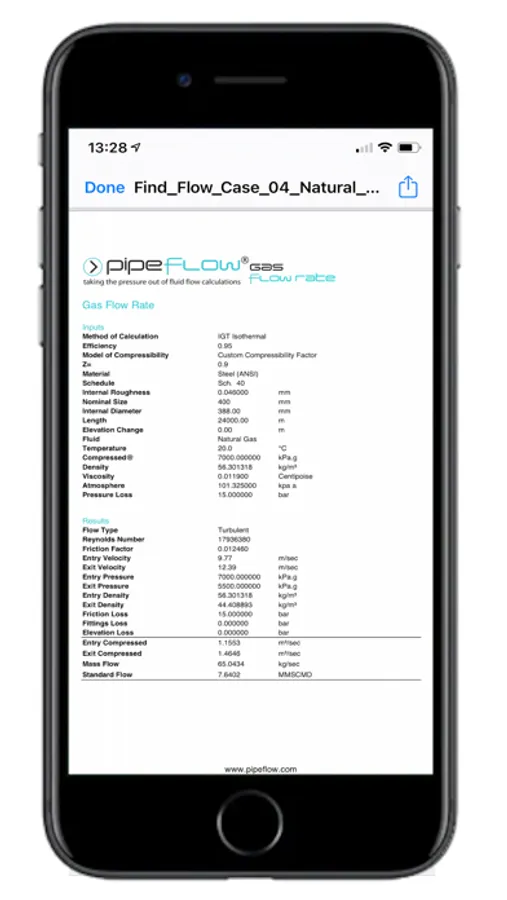 Engineers can easily perform their gas flow rate calculations in the office or on site. Professional Excel and PDF reports can easily be shared with others. Results can also be saved to the library within the App.