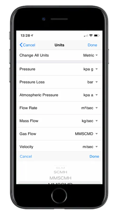 The App can operate in Imperial or Metric units and each individual field can be further customised to use a specific unit. Results values can be displayed to a specified number of decimal places.