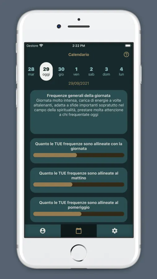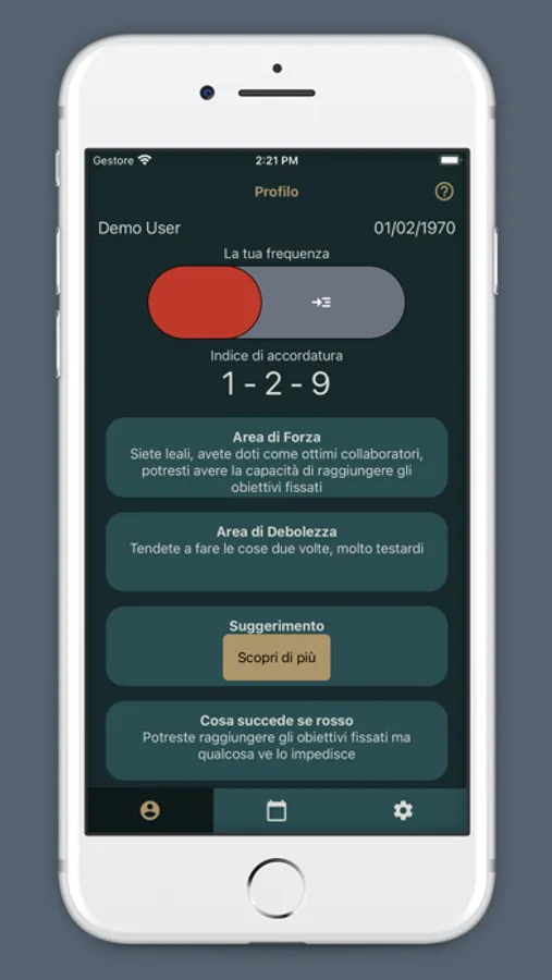 L'app avrà come prima schermata, oltre ai dati dell’utente, un indicatore a “semaforo” e sarà illuminato in base all’accordatura di frequenza determinata dai dati dell’utente (nome, cognome, data di nascita).