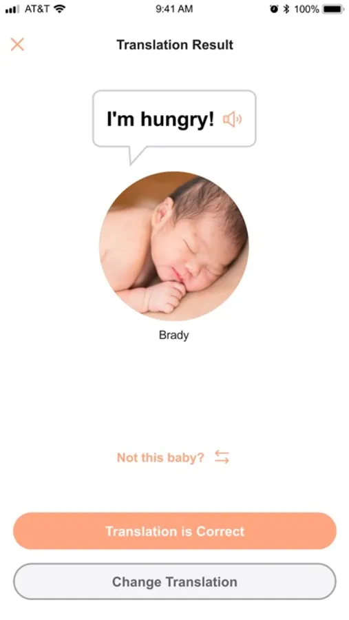 To train the app to learn a specific sound pick a context where you know with certainty what your baby is trying to say (e.g. at feeding time the baby is saying “I’m hungry”, at nap time the baby is saying “I need to rest”). Use the app to translate those sounds. You will get one of the eight general intents as a translation, select “No, Change it” and then provide the correct translation. Repeat this 5 to 10 times then wait up to 24 hours for the app to update and learn your baby’s sounds.
