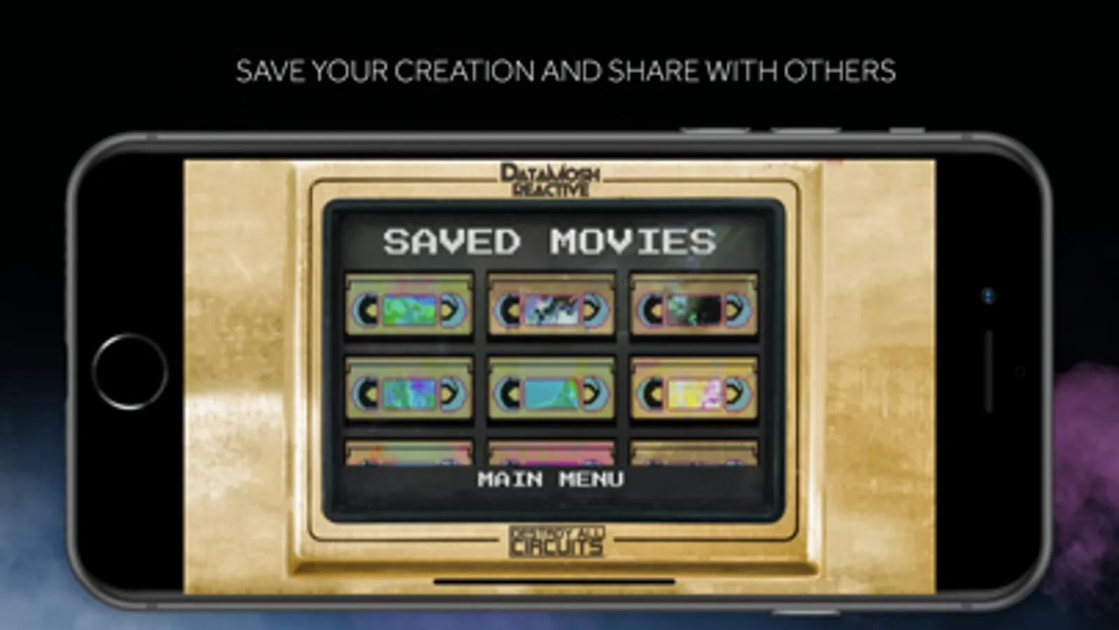 All of your saved videos are easily accessible by clicking the Saved Movies option. Here you can relive your favorite Datamoshed moments and share them with your mom by the press of a button.