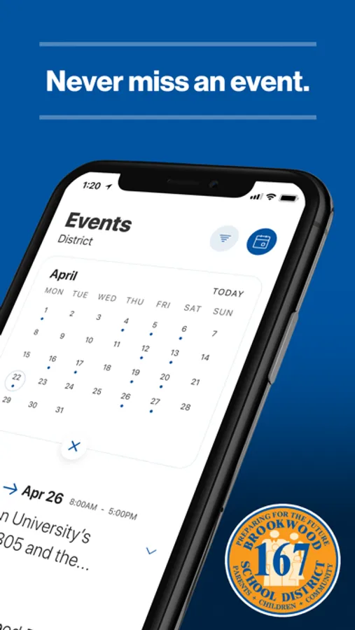 The event section shows a list of events throughout the district. Users can add an event to their calendar to share the event with friends and family with one tap.
