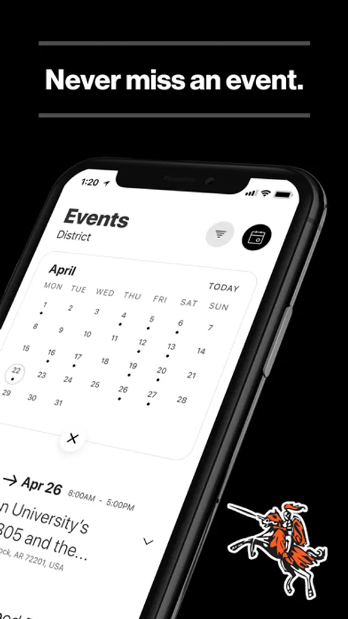 The event section shows a list of events throughout the district. Users can add an event to your calendar to share the event with friends and family with one tap.