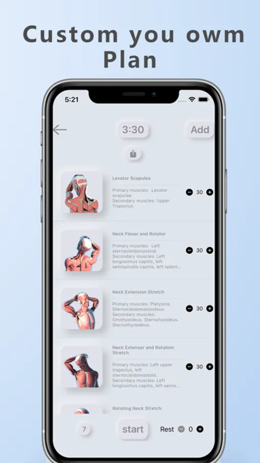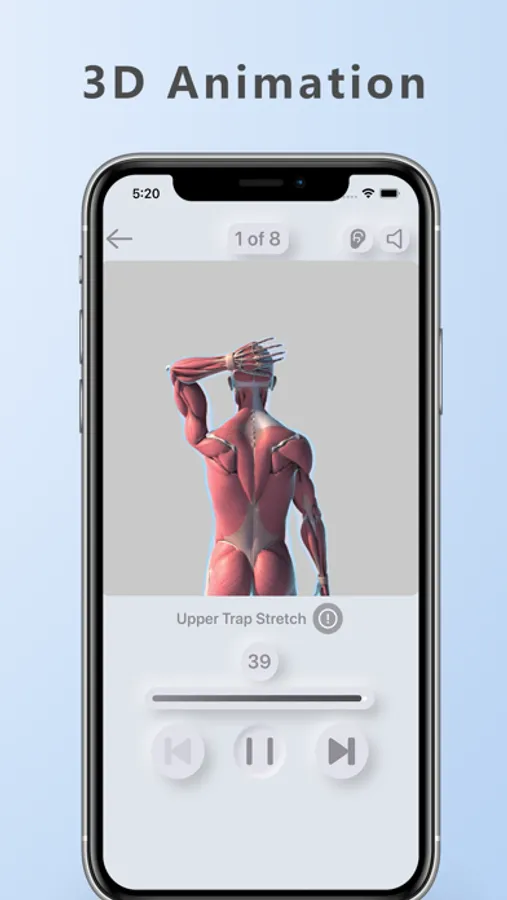 - 3D animation representations of each exercise, complemented by the detailed 3D animation of the primary and secondary muscles