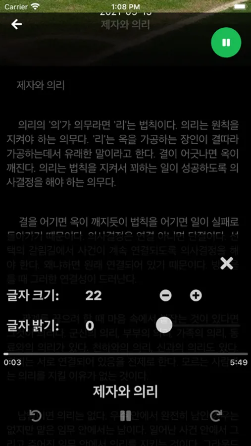 사용자는 문서의 폰트 크기와 폰트 밝기를 조절 할 수 있으며 주요 문서의 Audio 듣기 기능이 있습니다.