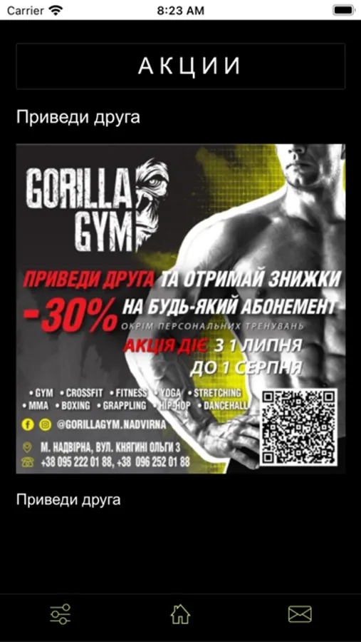 Мобільний додаток клубу дозволяє відвідувати клуб без клубної карти, керувати своїми витратами, бротювати тренування з тренером та групові заняття, буду в курсі подій клубу.